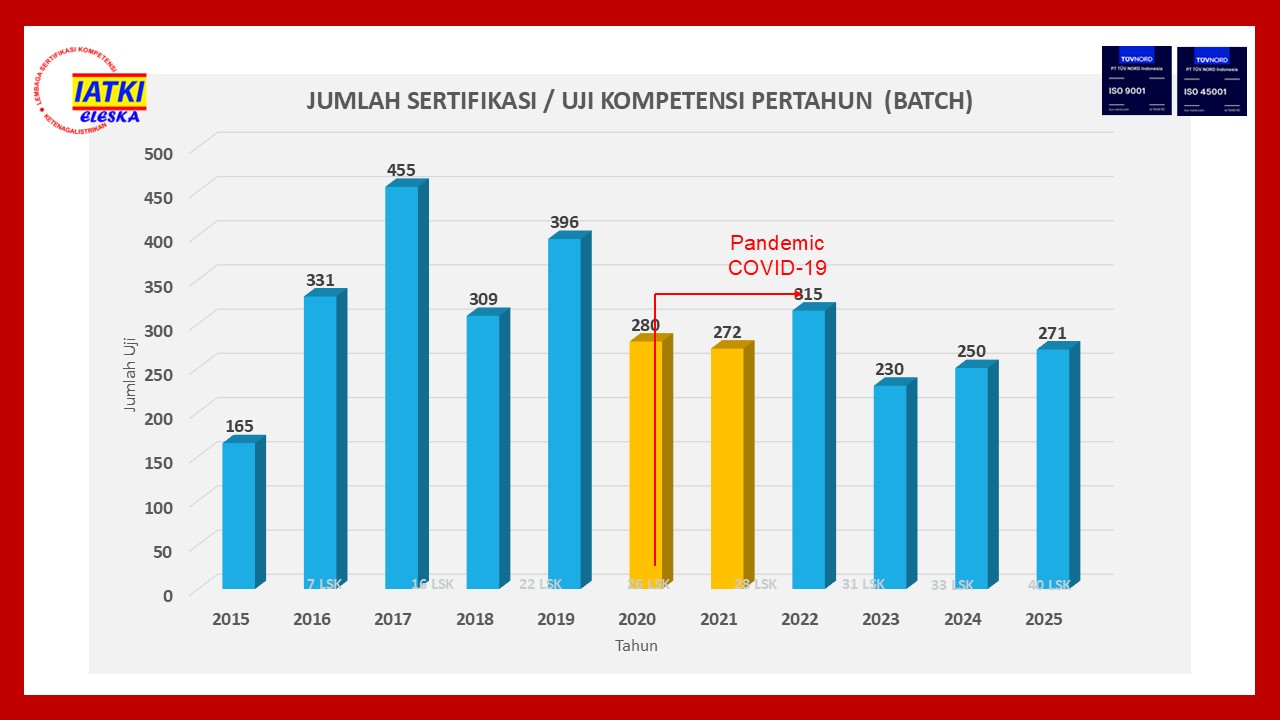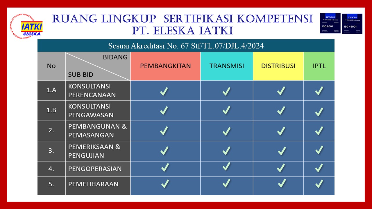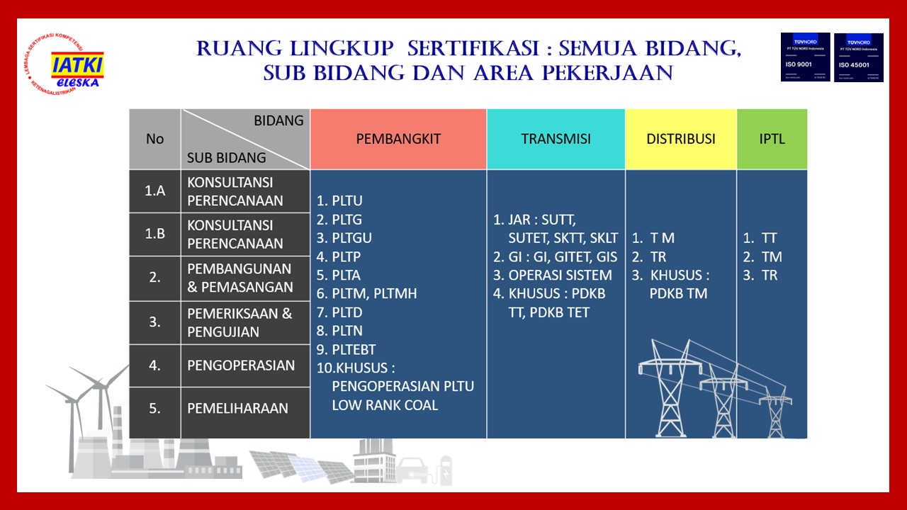 Maka Organisasi membentuk Lembaga Sertifikasi Kompetensi Ikatan Ahli Teknik Ketenagalistrikan Indonesia (LSK IATKI) sejak tanggal 1 September 2001, dan aktif sampai sekarang menyelenggarakan Sertifikasi Kompetensi Tenaga Teknik Ketenagalistrikan. Sesuai dengan Peraturan Pemerintah Republik Indonesia No. 62 tahun 2012 tentang Usaha Jasa Penunjang Tenaga Listrik pasal 2 bahwa Sertifikasi Kompetensi Teknik Ketenagalistrikan diklasifikasikan sebagai Usaha Jasa Penunjang Tenaga Listrik, dan pada pasal 3 ayat 1 menyebutkan: